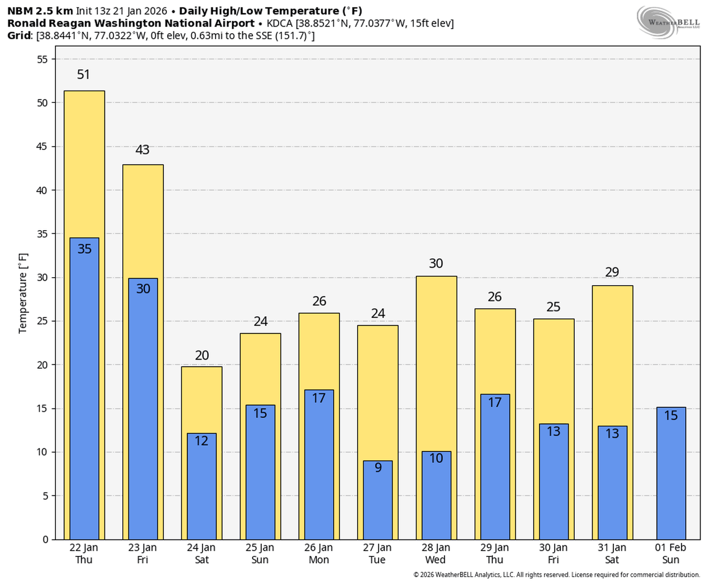 Whatever snow falls will stick around for a long time. Predicted highs next week are mostly in the 20s, and lows at night would probably frequently fall into the teens and single digits (in colder areas away from D.C.). Wind chill near or even below zero will be possible at times.