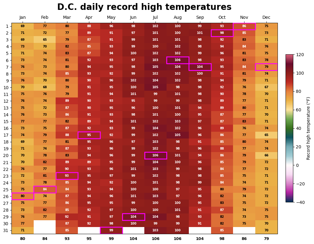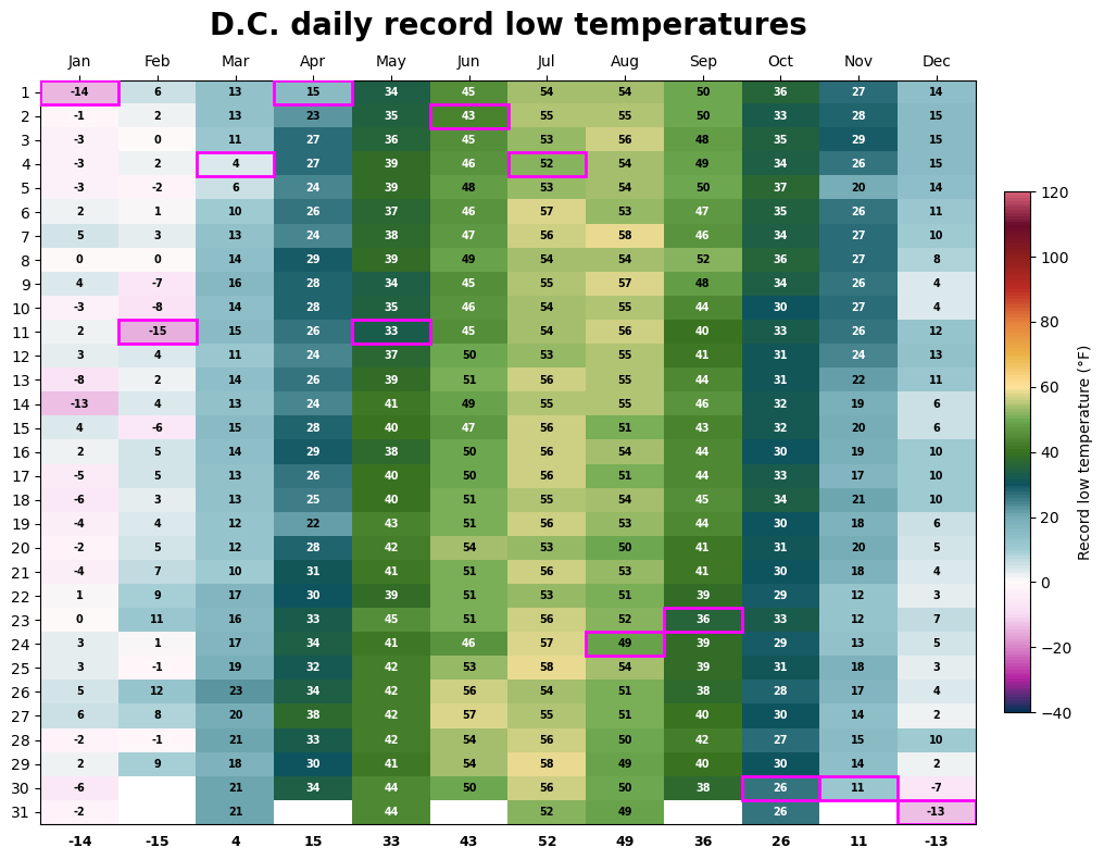 Record highs of 90 degrees or higher appear from mid-April through early October, reflecting the long reach of D.C.’s warm season. Record lows of 15 degrees or colder cluster between late November and early March, when blasts of Arctic air surge into the region.