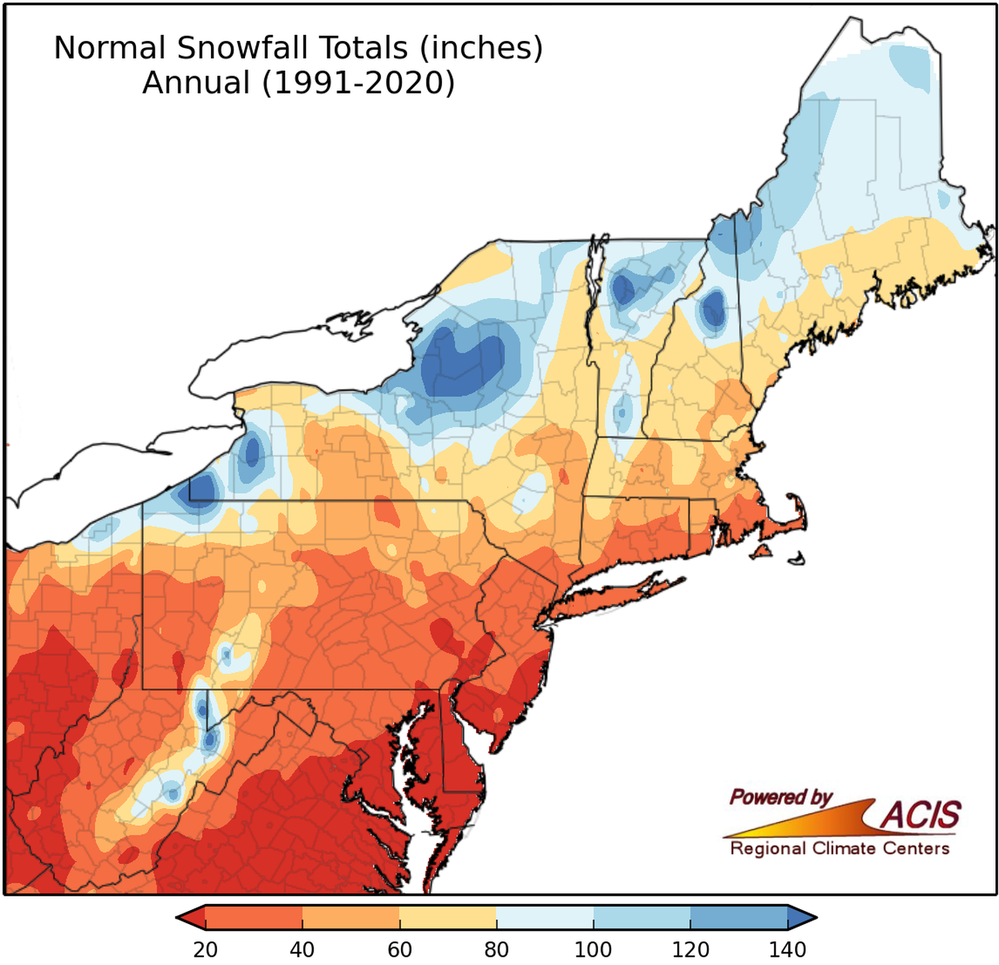 Over the long term, there is no such snow hole, as can be seen in the map of average annual snowfall below. The map shows gradually decreasing amounts of snow from the Northeast into the Mid-Atlantic, with no sign of a hole in the D.C. area.